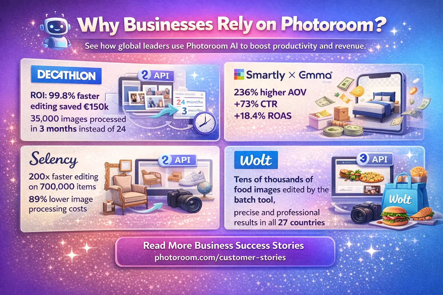 The following case studies demonstrate how Photoroom AI is utilized by global leaders in the retail, marketplace, and digital marketing environments to remove production bottlenecks and speed up revenue generation.